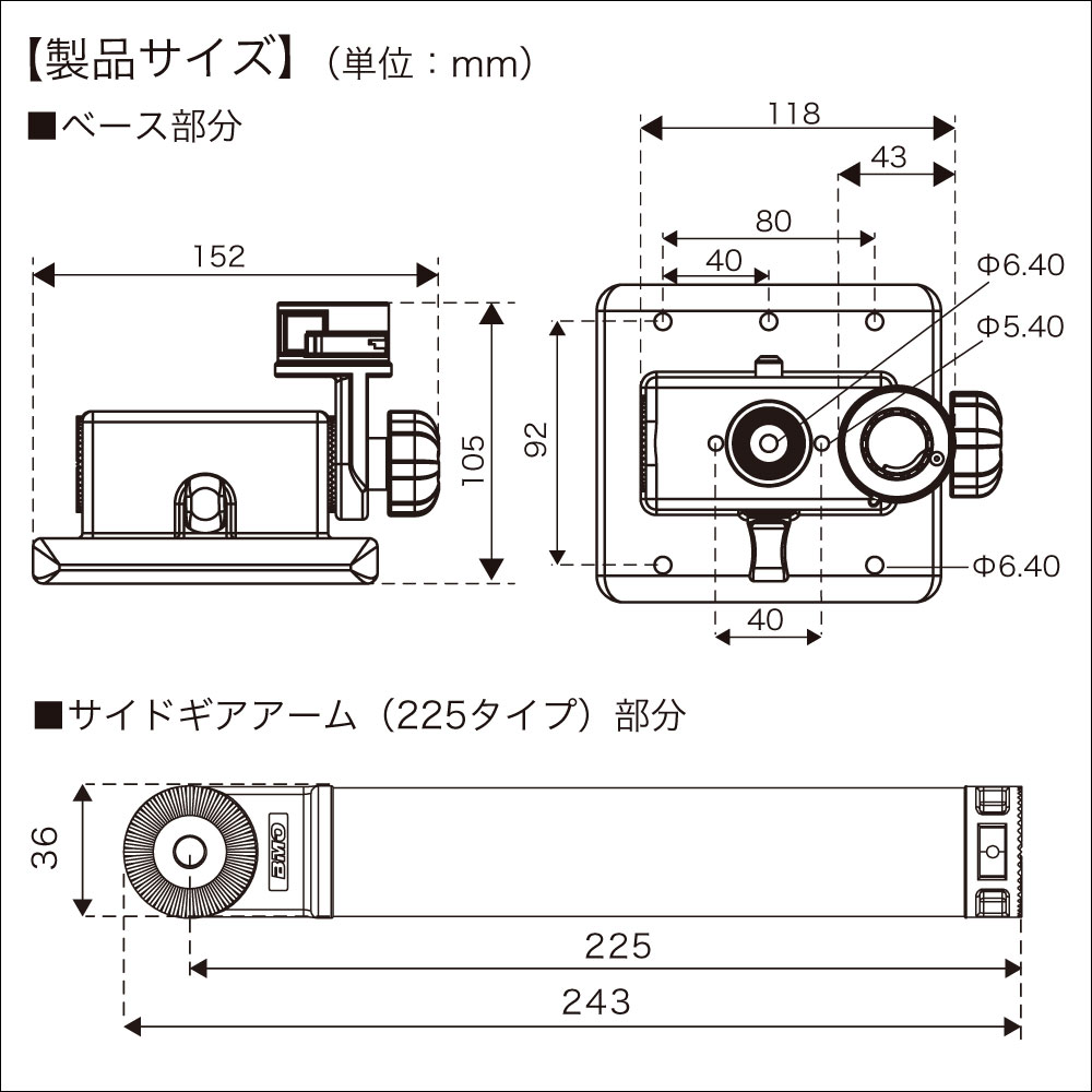 寸法図2(魚探マウント&センサーアーム) 寸法図1(ベース&サイドギアアーム) セット内容