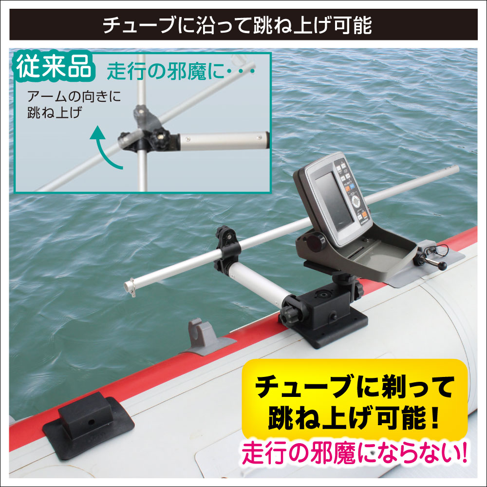 インフレータブルボートのチューブに沿った跳ね上げ動作が可能となり、移動時や未使用時の取り回し性が向上した、フィッシュセンサーアームと魚探マウントを組み合わせたフルセット品です。