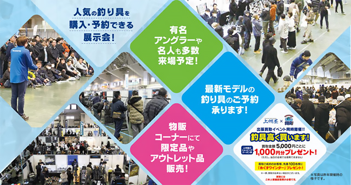 本イベントでは、参加メーカー各社の最新モデルの展示をはじめ、新製品の購入・予約受付、有名アングラーや名人によるステージイベントなど、一日中楽しめるコンテンツが盛りだくさんです。